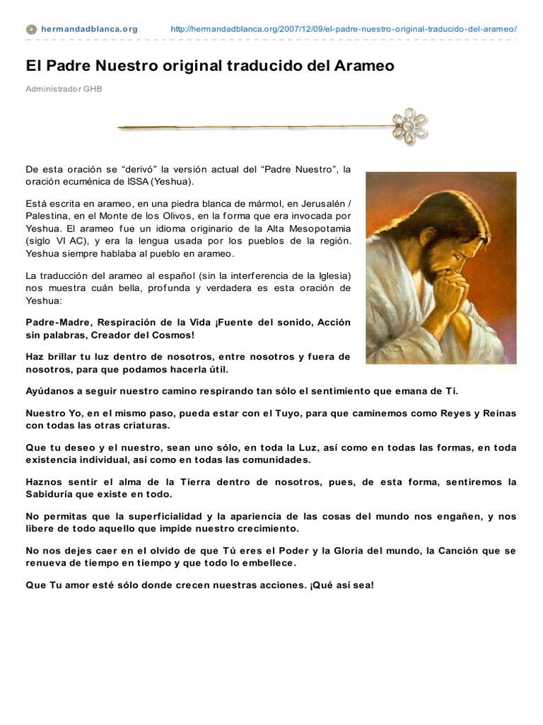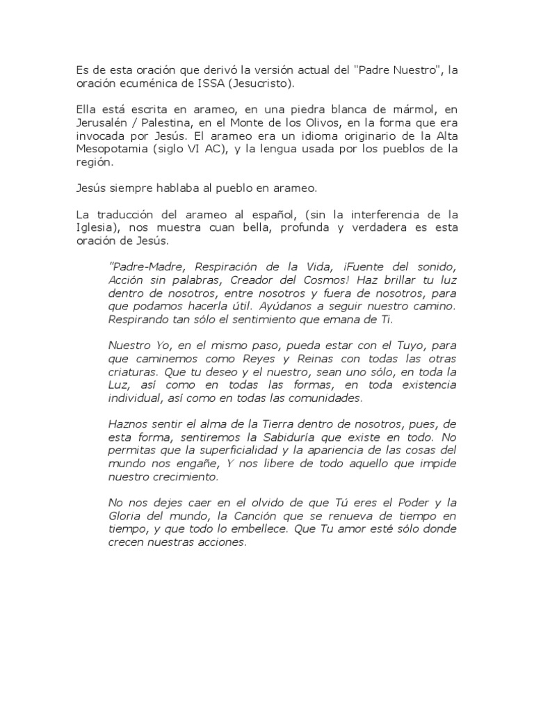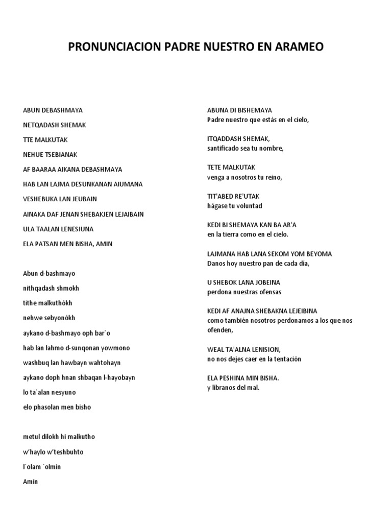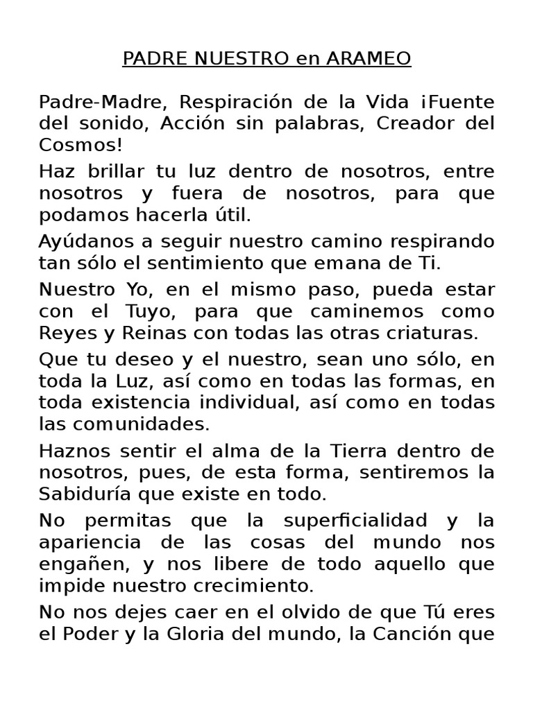 El Padre Nuestro Original Traducido Del Arameo. Esta circulando por la Red Mundial un supuesto documento arcaico y arqueológico el cual contendría en la lengua del Arameo la version o traducción ORIGINAL y mas fidedigna de la oración Modelo que nos dejara el Señor Jesucristo como lo es.