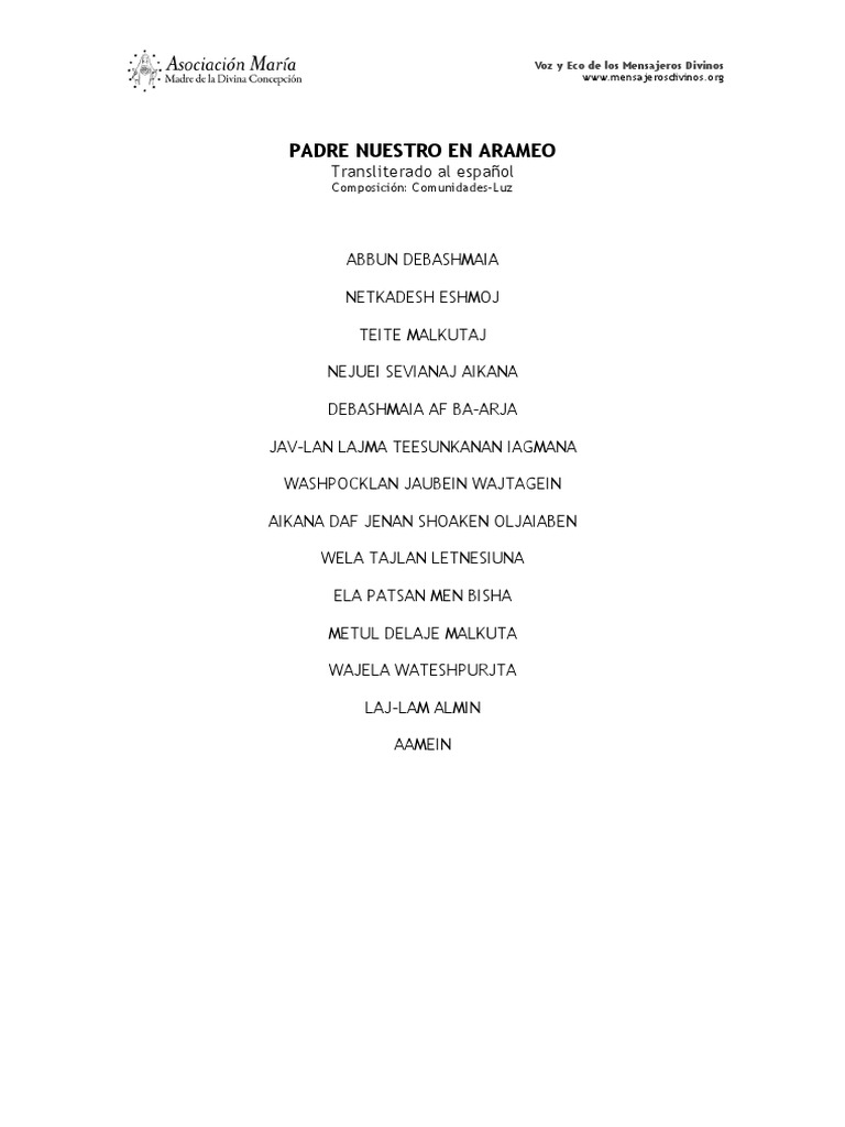 Padre Nuestro en Arameo Transliterado al español Abbun debashmaia Netkadesh eshmoj Teite malkutaj Nejuei sevianaj aikana Debashmaia af ba-arja Jav-lan lajma teesunkanan iagmana Washpocklan jaubein wajtagein Aikana daf jenan shoaken oljaiaben Wela tajlan letnesiuna Ela patsan men bisha Metul delaje malkuta Wajela wateshpurjta Laj-lam almin Aamein. Padre-Madre Respiración de la Vida Fuente del sonido Acción sin palabras Creador del CosmosHaz brillar tu luz dentro de nosotros entre nosotros y fuera de nosotros para que podamos hacerla útil. Nosotros y fuera de nosotros para que podamos hacerla útil.